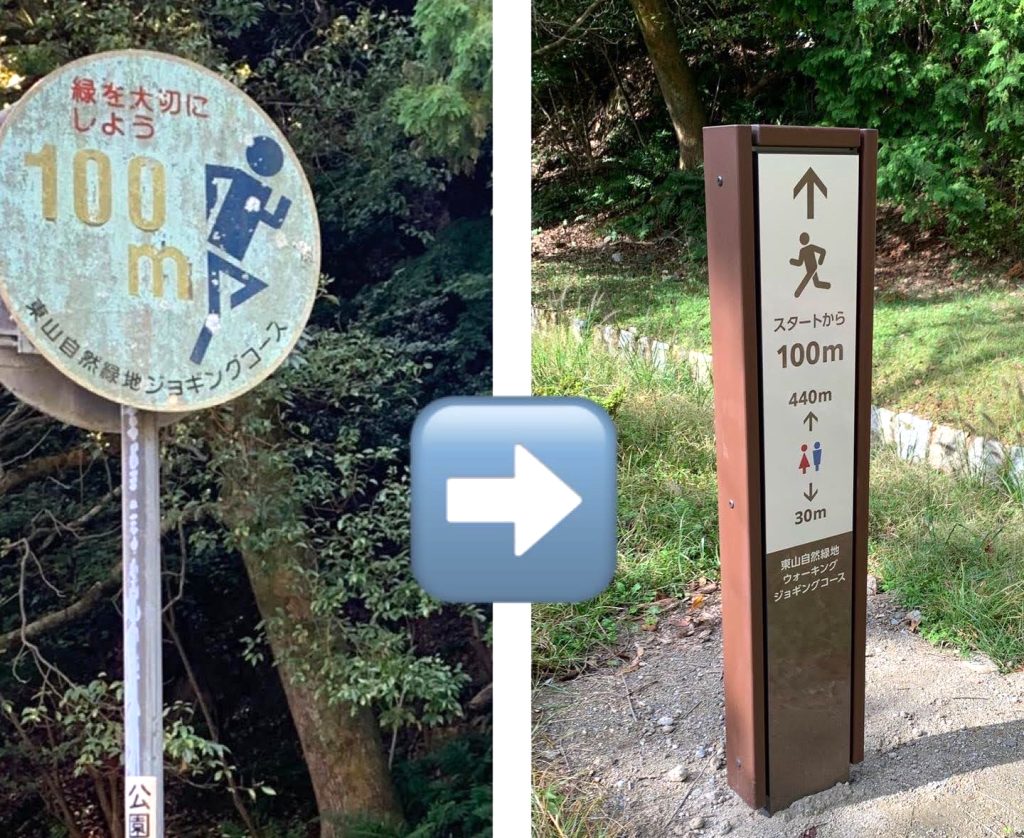 山科区を流れる琵琶湖疎水沿いの緑道が東山自然緑地です。再整備中である令和2年8月20日、まちづくり委員会にて設置を要望させて頂き、ベンチの増設や案内掲示板、古くなっている距離表等の設置が実現しました。